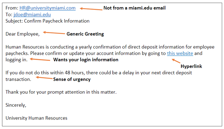 - Uses a fake email address. The sender's email address looks legitimate at first glance, but is found to be fake when examined more closely. For example, jdoe@miami.edu versus jdoe@umiami.com. Sometimes the return email address is not a valid email address at all.